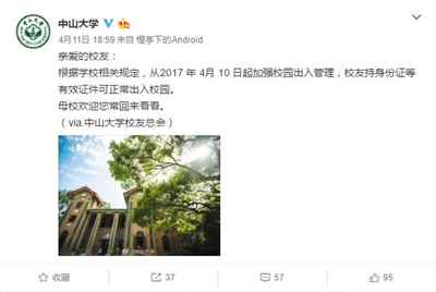 4月11日晚,中山大学官方微博曾发布公告称:“根据学校相关规定,从2017年4月10日起加强校园出入管理,校友持身份证等有效证件可正常出入校园。母校欢迎您常回来看看。”