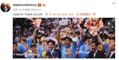 昨天下午,马布里通过微博向自己的粉丝表示感谢,并配发了率首钢男篮夺得CBA总冠军领奖时的图片。微博截图