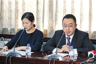 昨天下午,首钢男篮副总经理谢海田(右)在媒体发布会上介绍情况。图/Osports