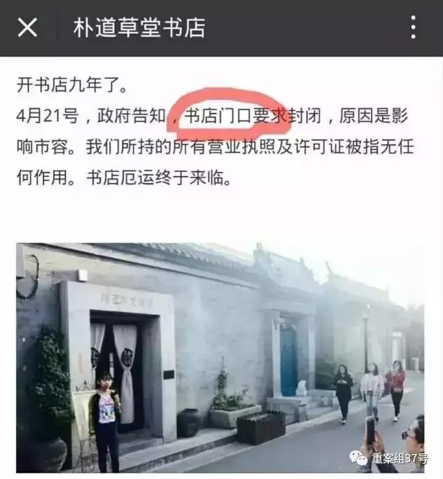 ▲朴道草堂书店微信公众号发布称书店门口要求封闭。 微信公众号截图