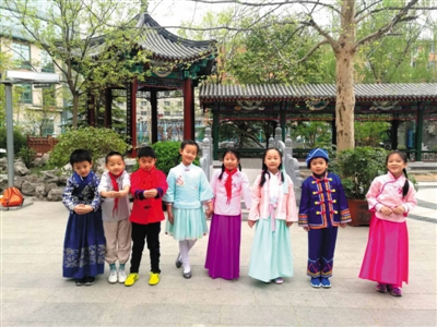 新京报讯 雕花回廊中,一位清朝“格格”在安静地看书;玉兰树下,一群“儒生”在诵读诗词……海淀区民族小学将每周五定为“传统服装日”,学生可自由选择穿本民族或其他民族的服装,如颜色鲜艳的维吾尔族服装,民国时期的学生装等等。展示民族传统服饰的同时,学生们也互相学习不同民族的语言、礼仪,了解服饰背后所蕴含的民族文化、传统文化。