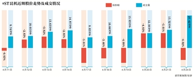 在3月29日再一次打开跌停板之后,3月30日,*ST昆机股价出现上涨,收盘时股价上涨1.6%。此后,在15个交易日中,*ST昆机有9个交易日以上涨收盘,其中,倒数第三个交易日上涨4.93%,倒数第二个交易日涨停。