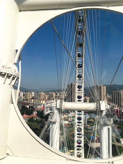 从摩天轮座舱内看窗外美景。