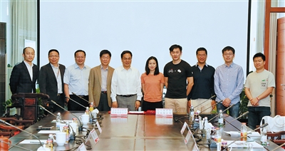 汉能控股集团董事局主席李河君(左五)、摩拜单车创始人兼总裁胡玮炜(右五)出席签约仪式。