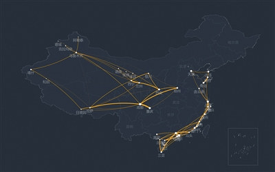 从滴滴出行数据看“一带一路”国内主要节点城市联系。
