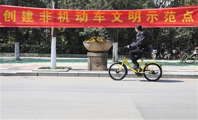 一位骑共享单车的南京市民看路边的标语。5月15日起,南京市违法违规使用共享单车者,将被录入“黑名单”。图/视觉中国