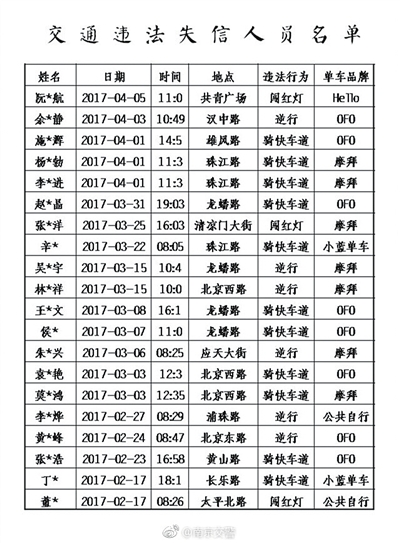 15日上午,南京市公安局交通管理局通过官方微博,发布了一份《交通违法失信人员名单》,名单中共涉及20人,姓名被隐去一字,违法时间自2017年2月17日,至4月5日,均记录有交通违法时间、地点和具体行为,并标注“单车品牌”。其中,涉及OFO使用者8人,摩拜7人,小蓝单车2人,哈罗单车1人,另有2人为公共自行车使用者。其交通违法情形中,逆行6人,骑快车道11人,闯红灯3人。