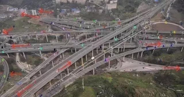 桥上密密麻麻的匝道分为了5层,20条匝道向8个方向延伸而去。重庆三横线、内环高速及机场专用高速三条道路在此相交,同时周边原有低速道路与三条高速在此相接,道路密集,高低不同,加上拐弯、转向等设计,让人很难分清每条匝道到底通向哪个方向。