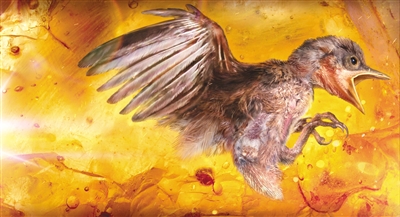 琥珀标本蕴藏着几乎完整的雏鸟。