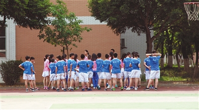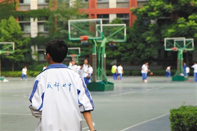 2017年6月9日,成都七中高新校区,一初中生身着校服在操场上活动,校服背面成都七中字样是成都七中校服标志之一。