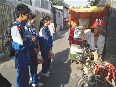 6月的一天下午,附近中学的学生找安林学北京方言,安林很乐于跟年轻人讲关于老北京的一切。