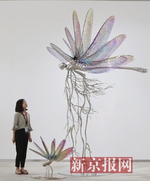 “再生”艺术展上蜻蜓与藤蔓的艺术品。