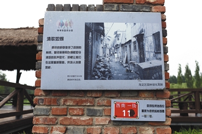 2017年7月25日,中关村森林公园内,唐家岭村的老照片和原址老门牌。曾经的蚁族聚集地变身公园,保留了一些原有建筑。新京报记者 浦峰 摄