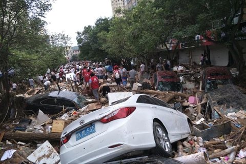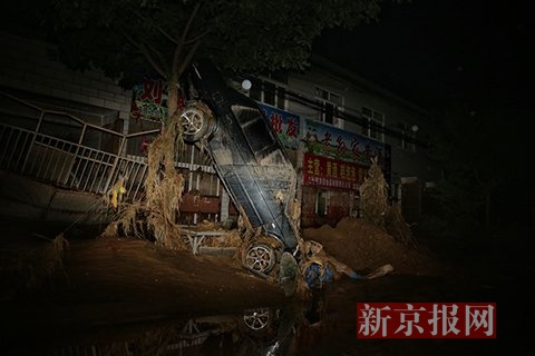 7月27日凌晨,陕西绥德县,街边倒立着一辆被洪水冲毁的汽车。