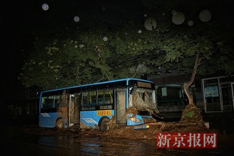 7月27日凌晨,陕西绥德县,街边停放着被洪水冲坏的公交车。本组图片摄影:新京报记者 彭子洋