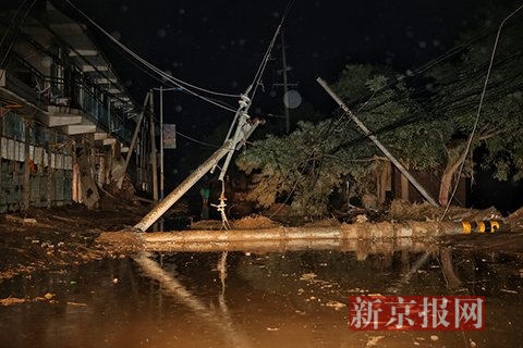 7月27日凌晨,陕西绥德县,街边数根电线杆被洪水冲倒。