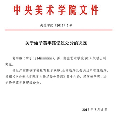 这份落款时间7月5日的《决定》称,葛宇路严重影响学校教育教学秩序、生活秩序及公共场所管理秩序,根据《中央美术学院学生违纪处分条例》第十六条,经学校研究,决定给予葛宇路记过处分。