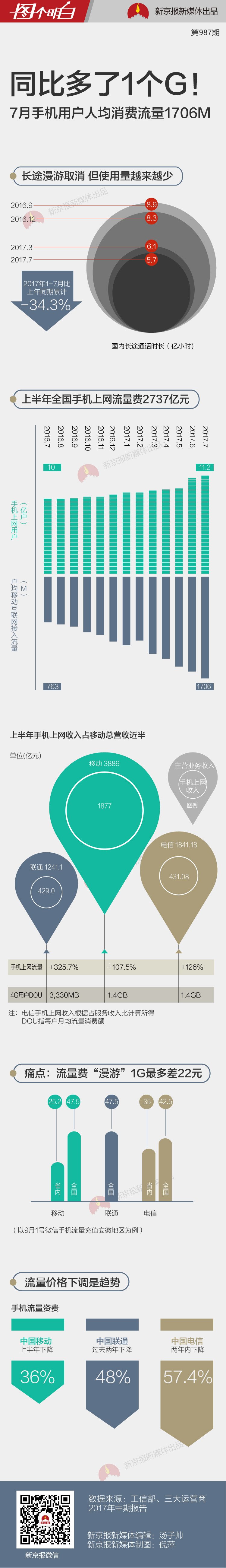 但消费者可能对流量“红利”的需求更高。工信部数据显示,在手机长途漫游费取消的同时,国内长途去话通话时长在持续下降。今年1至7月累计通话时长,比上年同期下降34.3%。与此同时,手机上网用户户均移动互联网接入流量从2016年7月的763M上升到2017年7月的1706M,同比上涨123.5%。