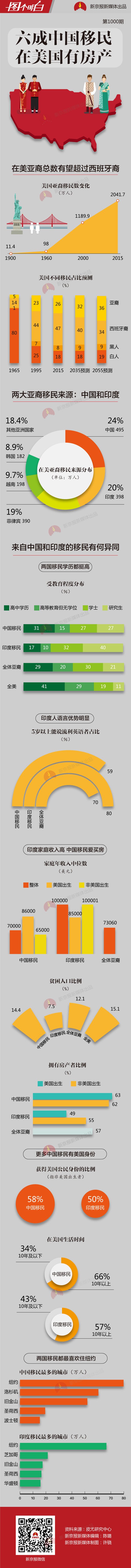 美国亚裔移民最大的来源地是中国,其次是印度。中国移民和印度移民在美国的状况有何异同?中、印两国移民都很好学,学历整体高于全美平均水平,不过印度移民中拥有学士及以上学位的比例,高于中国移民。收入方面,非美国出生的中国移民中,家庭年收入中位数为6.5万美元,而印度移民中这个数字达到10万美元。如果是在美国出生,中、印移民的家庭收入差不多。但和印度移民相比,中国移民更喜欢买房产,不论是否在美国出生,拥有房产的比例都超过六成。(更多新闻,请关注新京报微信公号:bjnews_xjb)