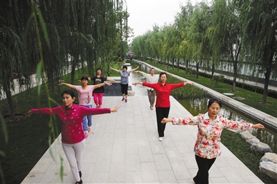 9月25日,居民在玉河边上跳舞。今年8月,玉河改造工程二期完工,有着700年历史的河流重回居民生活中。本版摄影(除署名外)/新京报记者 王贵彬 摄