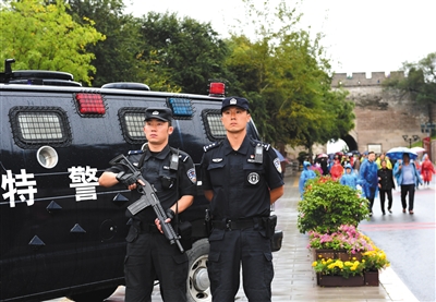 昨日,延庆公安分局民警在八达岭长城景区西门外广场执勤。