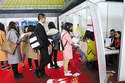 3月11日,2017年“百企万岗”大学生就业公益招聘在武汉大学举行,近200家企业为学子提供6000多个岗位。招聘会吸引了一万多名学子前来咨询。图/视觉中国
