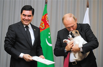 当天,普京在黑海海滨城市索契会见到访的土库曼斯坦总统库尔班古力·别尔德穆哈梅多夫。美联社报道,正式会谈开始前,别尔德穆哈梅多夫把这只可爱的幼犬从笼子里拿出。他说:“我们有着共同的朋友,这是世界上独一无二的(顶级品种)中亚牧羊犬。今天,我将它带来(送给你)。”