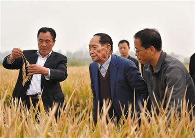 10月15日,“杂交水稻之父”袁隆平在邯郸永年超级杂交水稻百亩示范田,查看杂交水稻情况。