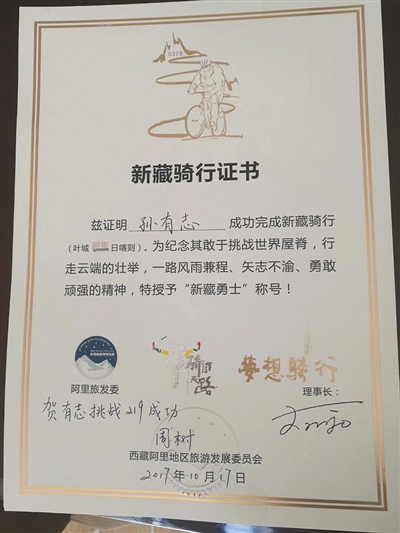 10月17日,孙有志获得由阿里地区旅游发展委员会颁发的《新藏骑行证书》,并被授予“新藏勇士”称号。