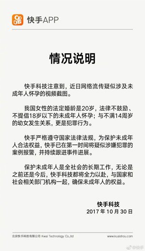 针对此事,快手科技官方微博在网友微博评论中回复情况说明称,快手科技注意到,近日网络流传疑似涉及未成年人怀孕的视频截图。我国女性的法定婚龄是20岁,法律不鼓励、不提倡18岁以下的未成年人怀孕;与不满14周岁的幼女发生关系,是犯罪行为。为保护未成年人合法权益,快手已将疑似涉嫌犯罪的案例报警,并持续跟进事件进展。