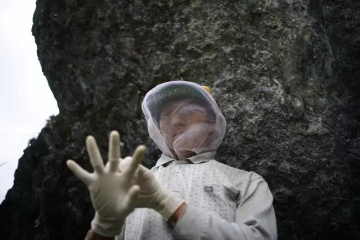 ▲10月5日,陈古吉戴着防蜂蜇装备准备查看布置在岩壁上的蜂箱蜂蜜生产情况。