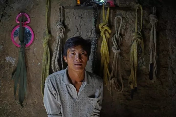 今年他把蜂桶增加到27个,把它们放在悬崖村各个地方收集蜂蜜。“但不会27个蜂桶都有蜜,有不少是空的”,陈古吉说蜜蜂不是他养的,都是纯野生迁移的,蜜蜂冬天因为冷住在对面崖壁的洞里,夏天才有选择性地飞进他做好的蜂桶里。