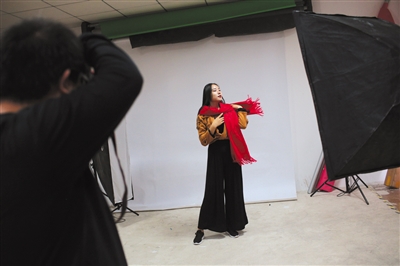 11月8日,创业学院摄影棚里,朱婉绮正在镜头前展示一款围巾产品。