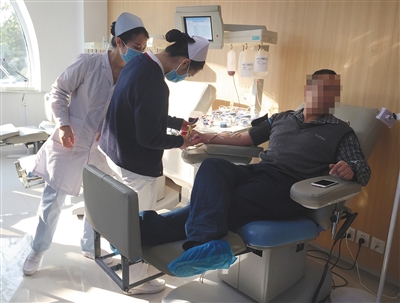 11月16日,燕郊一献血屋采血室内,一名白血病患者家属正在进行“互助献血”。