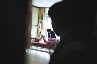 11月16日,燕郊燕达陆道培医院,因为肠道排异反应,10岁的白血病患者萱萱(化名)躺在病床上输液,其母亲在一旁照顾,父亲则透过门缝看孩子一眼。A08-A09版摄影/新京报记者 大路