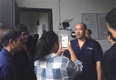 企业用钉钉为员工录入人脸信息,身后为新推出的智能人脸识别打卡机。 受访者供图