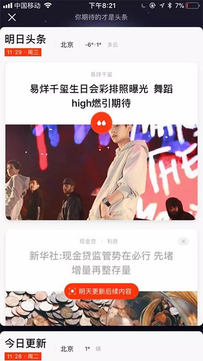 打开今天的新浪新闻客户端,迎面而来的是易烊千玺生日祝福的大幅开机屏,宣告着“明日头条”来了。