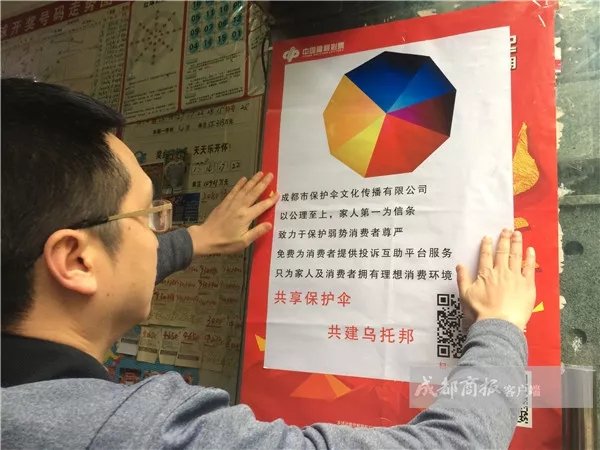 ▲陈杰在张贴公司海报。图片来自成都商报