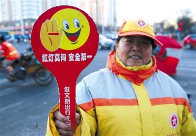 12月20日,六道口路口,文明引导员陈华在斑马线前维持秩序。
