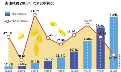 东方财富网信息显示,2008年海康威视营业收入仅为17.4亿元,2016年增至319亿元,每年的收入增幅都在20%以上,最高一年是在2010年,营收增长了71.57%。盈利能力上来看,海康威视2008年净利润为5.49亿元,2016年达到了74.2亿元。