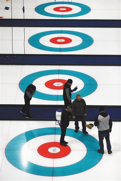 工作人员清理赛场,江陵冰壶中心已准备就绪。图/视觉中国