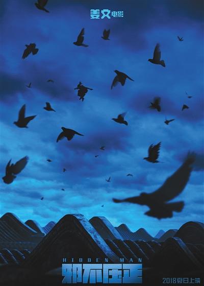 第三张海报以蓝色为主打背景,整个画面被一群黑鸟填充,但中间却有一个飞檐走壁的人形黑影,给观众营造一种惊悚感。
