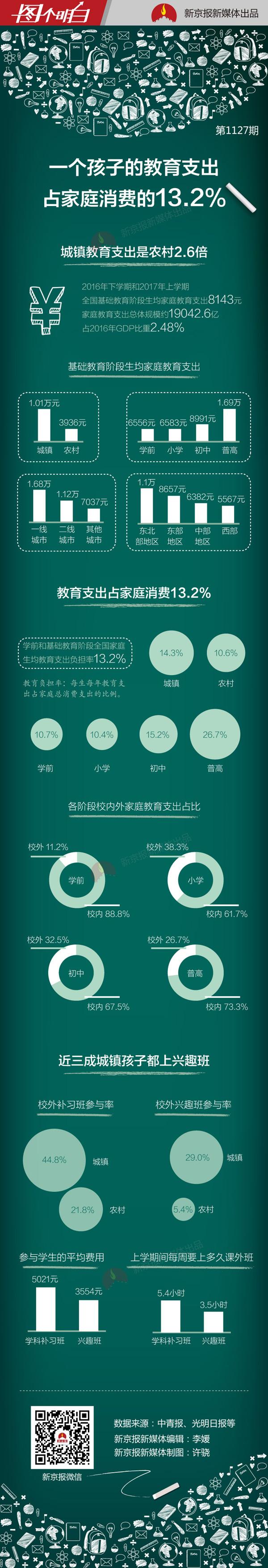 去年,你家孩子报了多少课外班?花了多少钱?北京大学中国教育财政科学研究所针对家庭教育支出的最新一项调查显示,2016年下学期和2017年上学期,全国学前和基础教育阶段家庭教育支出总体规模约19042.6亿元,生均家庭教育支出8143元,其中农村3936元,城镇1.01万元。