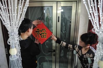 2月15日,除夕,小林回到家后和母亲一起贴福字。