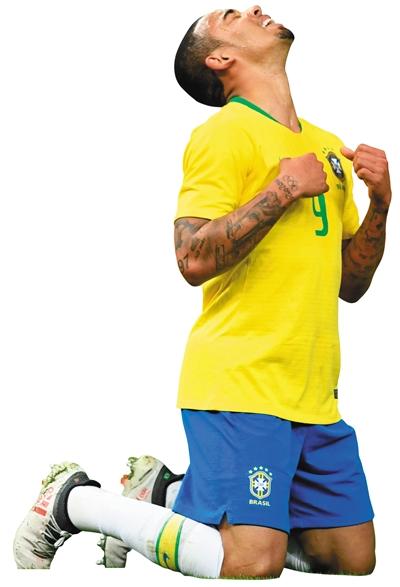 热苏斯跪地庆祝,他为巴西队打入制胜球,终结德国队22场不败。 图/视觉中国