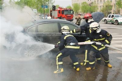 现场消防队员先后用干粉灭火器和消防水枪对汽车进行了灭火。