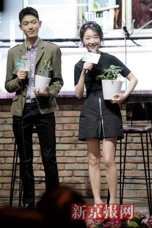 演员王锵(左)与演员周冬雨手持绿植出场。新京报记者 朱骏 摄
