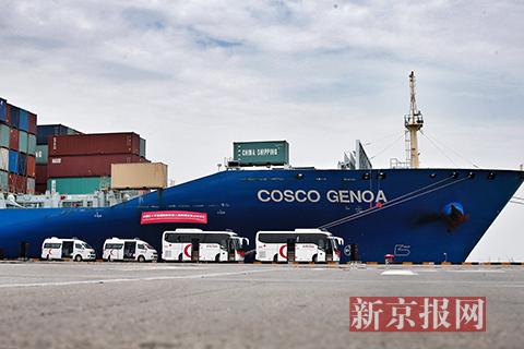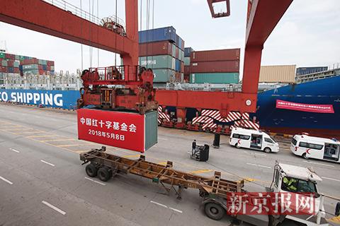 中国红十字会首批援助叙利亚人道救援设备在上海外高桥码头启运。