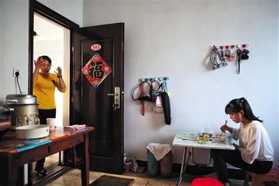 5月31日,出租房内,女儿在吃饭,杨雨菲在一旁忙家务。