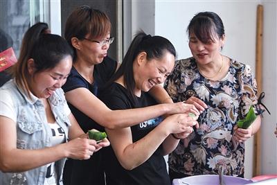 6月2日,出租房内,杨雨菲和同是陪读家长的邻居们一起包蜜枣粽子。